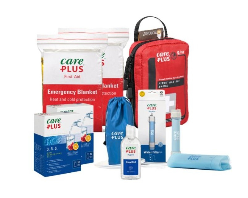 Het pakket bestaat uit 2 verpakkingen Care Plus® O.R.S., een Care Plus® Water Filter Evo (1 stuks), 1 stuks CP® Hygiene Gel (100 ml), een Care Plus® First Aid Roll Out – Light & Dry Medium (42-delig) en 2 stuks Care Plus® Emergency Blankets. Ideaal voor reizigers, buitensporters en als extra noodvoorziening thuis of in de auto.